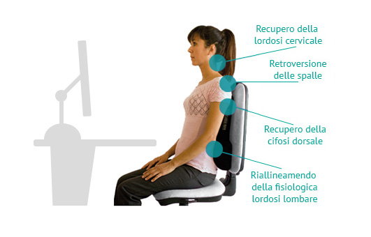 Mantenere una postura corretta davanti al computer significa rispettare le normali curve della colonna vertebrale. Ciò si verifica quando si utilizza una sedia speciale o un dispositivo ergonomico come il Cuscino Ergonomico Komfort che obbliga la colonna vertebrale e muscoli della schiena ad osservare una postura corretta per prevenire il dolore e l’affaticamento muscolare.