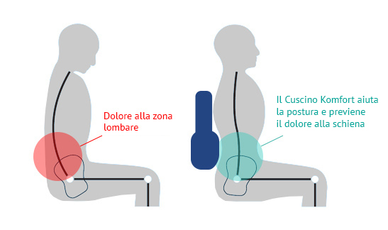Inoltre, il Cuscino Ergonomico Komfort aiuta addome e torace a rilassarsi. Grazie alla sua azione sui muscoli lombari, Komfort elimina le fastidiose sensazioni di indigestione, pesantezza addominale, respiro corto e dolore al petto, sintomi che spesso affliggono chi lavora per lunghe ore in posizione seduta.